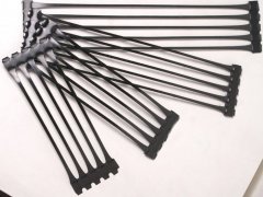 單向拉伸土工格柵是一種以高分子聚合物為主要原料,加入一定的防紫外線、抗老化助劑,經過單向拉伸使原來分布散亂的鏈形分子重新定向排列呈線性狀態,經擠出壓成薄板再沖規則孔網,然后縱向拉伸而成的高強度土工材料。這種過程中使高分子成定向線性狀態并形成分布均勻、節點強度高的長橢圓形網狀整體性結構。此種結構具有相當高的拉伸強度和拉伸模量,抗拉強度達到100-200Mpa,接近低碳鋼的水平,大大優于傳統的或現有的加筋材料,給土壤提供了理想的力的承擔和擴散的連鎖系統。該產品拉伸強度大(>150Mpa),適應各種土壤,是目前廣為采用的加筋加固材料。