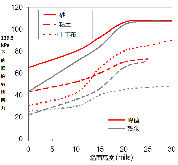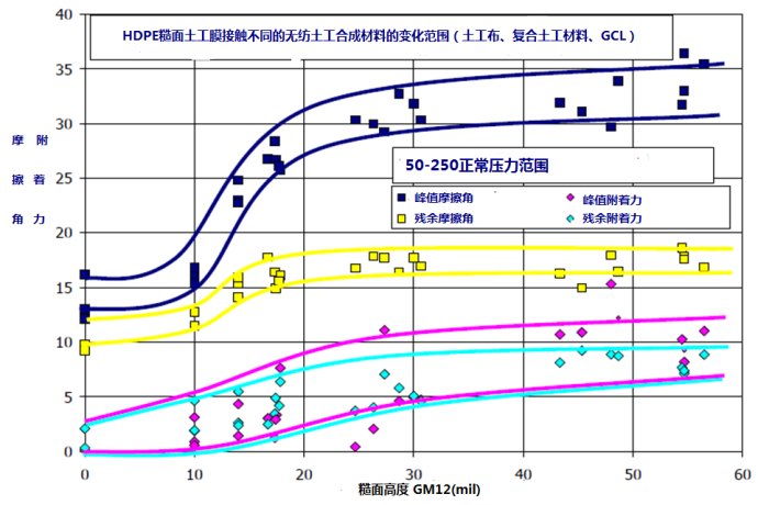 圖1和圖2分別是糙面土工膜與各種不同的土工合成材料接觸,摩擦角、附著力和剪切應力的變化曲線。可以清晰的看到,當糙面土工膜的糙面高度從0.25毫米(10密爾)增加到0.5毫米(20密爾)時,土工膜與其它材料之間的的剪切強度和摩擦角顯著增加,而超過0.5毫米(20密爾)的糙面高度對剪切強度和摩擦角的影響減弱。因此,0.5mm的糙面高度是一個最佳的高度值。